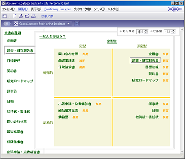 CrossConcept Positioning Designerは、CrossConcept版のポジショニングマップ(positioning map)…のようなものです。軸そのものを検討の対象とするCrossConceptの趣旨を表すために、この作業をマッピング(mapping)ではなくデザイン(designing)と呼び、CrossConceptの冠をかぶせておくことにします。