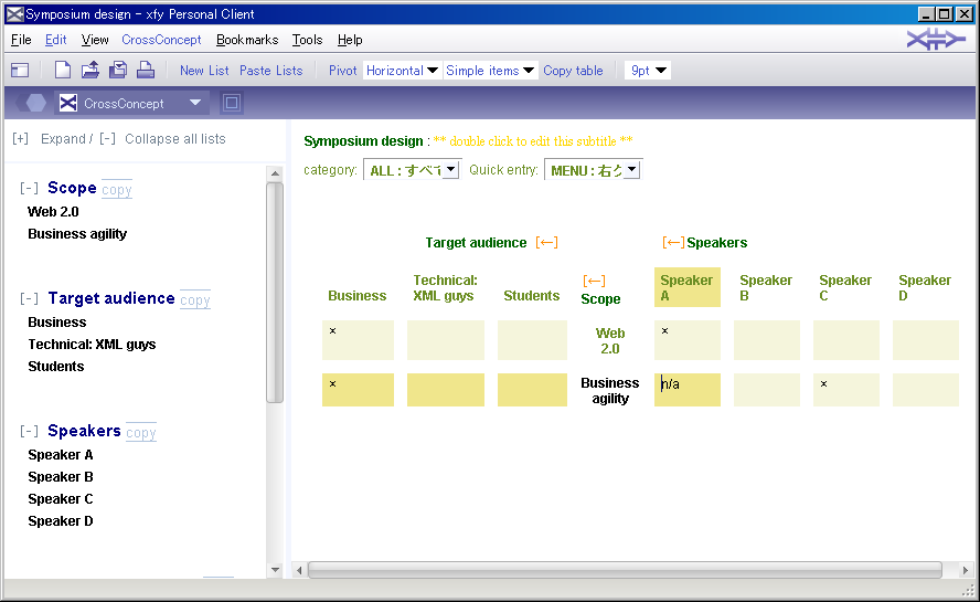CrossConcept is designed to support your intellectual and emotional activities. Using CrossConcept, you can externalize your concept operations that you may perform in your brains.